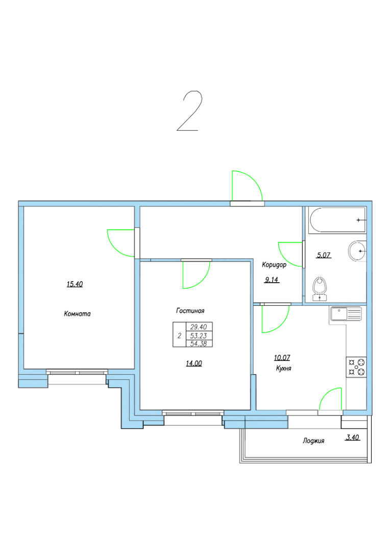 2-комнатная квартира 54,38 м²